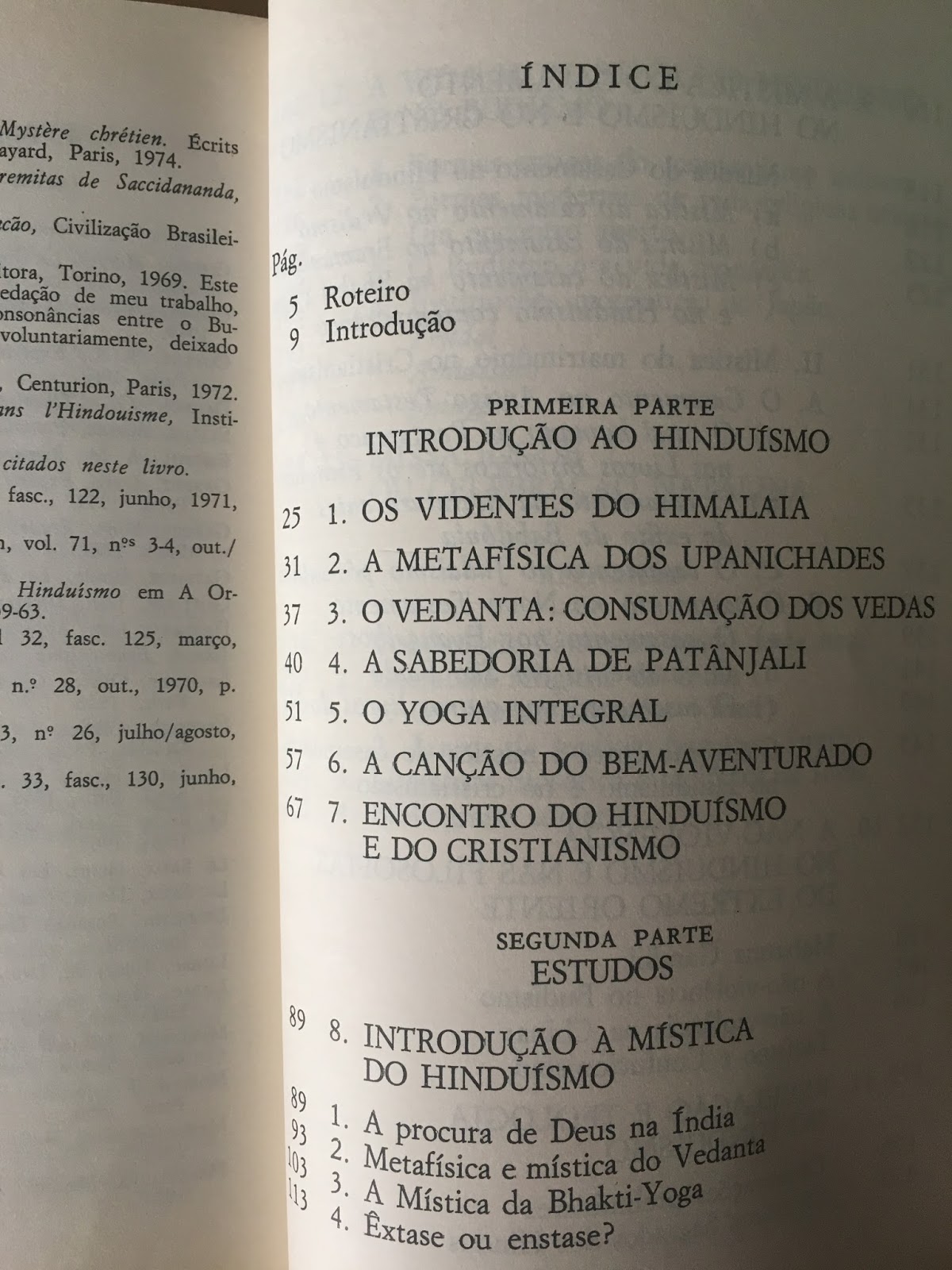 O autor não pretende estabelecer - como à primeira vista o título poderia sugerir - um paralelo ou confronto entre duas religiões, dois sistemas de vida, duas filosofias, duas místicas etc. O objetivo do trabalho é apresentar aos leitores brasileiros uma pequena introdução, mais acessível ao estudo do Hinduísmo, oferecendo algumas informações históricas e algumas reflexões mais aprofundadas sobre a doutrina dos grandes livros de filosofia espiritualista hindus. A penetração cada vez maior em nossos meios das doutrinas e técnicas de espiritualidade do Extremo Oriente, bem como a aceitação sempre mais crescente que elas encontram em todos os ambientes, particularmente entre os jovens exigem maior interesse e atenção por parte dos estudiosos dos comportamentos religiosos em nossa sociedade. E aqui está um ensaio de compreensão e discernimento.